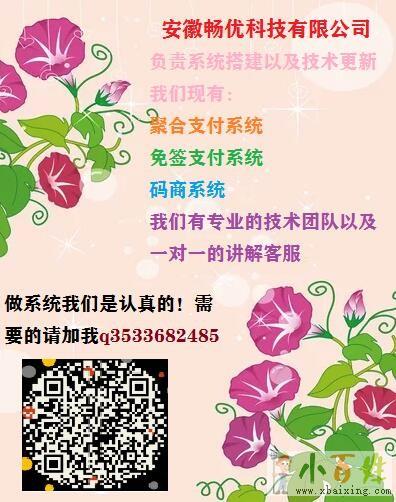 安徽畅优科技有限公司是一家以聚合支付系统、免签支付系统,码商系统开发及搭建等技术为核心的科技公司小~百~姓~网。主要产品有:聚合 支付系统、免签支付系统,码商系统。聚合支付系统可以将市面上主流的一个以上的银行、非银机构或清算组织的支付渠道整合到一个 付款渠道接口,发放给下级商户用户使用;免签支付系统专为个人、企业收款而生的支付工具,为支。付宝、微欢迎www.xbaixing.com。信支付的个人账户、企业 账号,提供即时到账收款API接口;码商系统是供码商在供码平台代收款获得收款提成,接口对接方免去死码风险,低费率收款,码商 系统赚取中间费率差价。